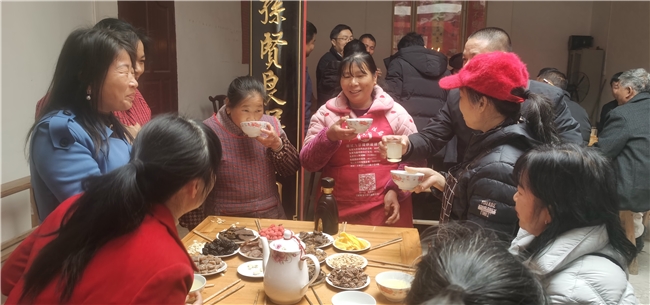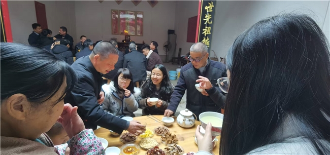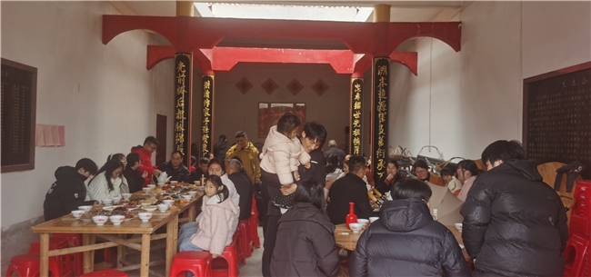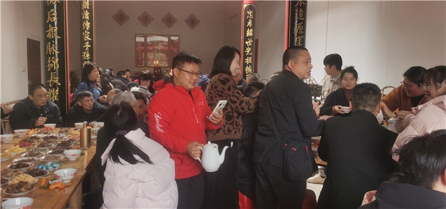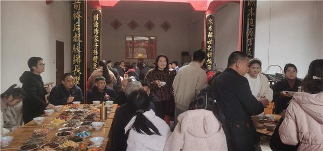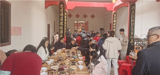 宗祠之内,人声鼎沸、暖意融融。叔伯婶姆、兄弟姐妹、子侄晚辈围坐一堂,久别重逢的喜悦溢于言表。大家互道新年祝福,畅谈一年来的工作生活,分享在外的见闻与家乡的变化。儿时的趣事、家族的往事、未来的期望,在欢声笑语中娓叙来。没有生疏与隔阂,只有血浓于水的亲近与坦诚,处处彰显着客家人淳朴热情、宗亲团结的淳朴家风。